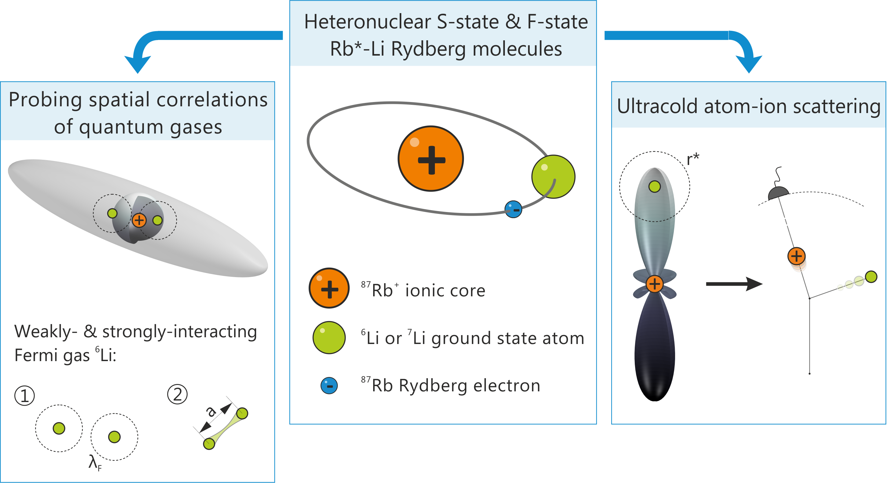This projects aims at the first experimental realization of heteronuclear Rydberg molecules and their use as a microscopic correlation probe for degenerate quantum gases as well as an integral part in the study of ultracold atom-ion collisions in the quantum regime.