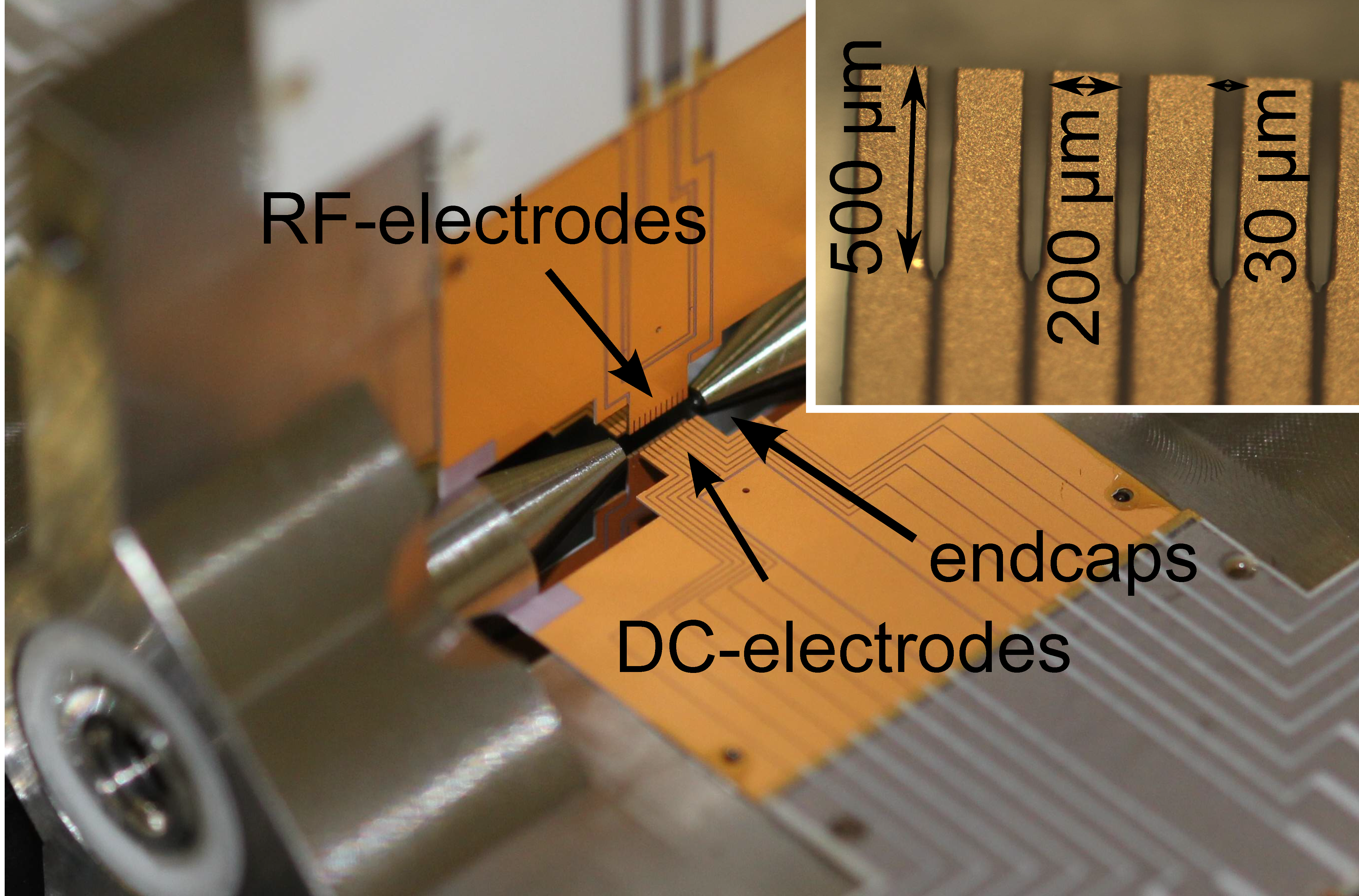Figure 2: Multi-segmented linear Paul trap fabricated for Rydberg excitation of trapped ions.
