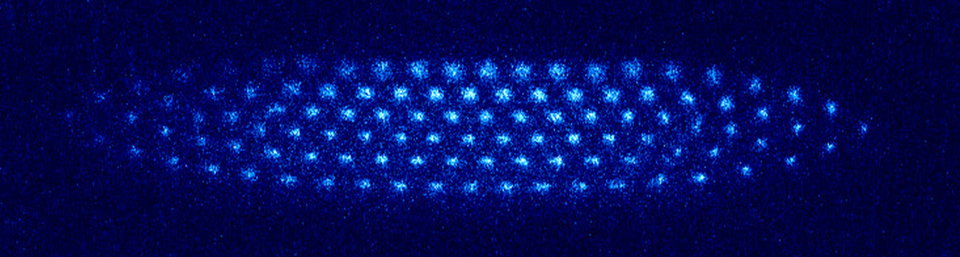 Figure 1: Calcium ions trapped in a Paul trap in form of a planar crystal and imaged via their fluorescence.